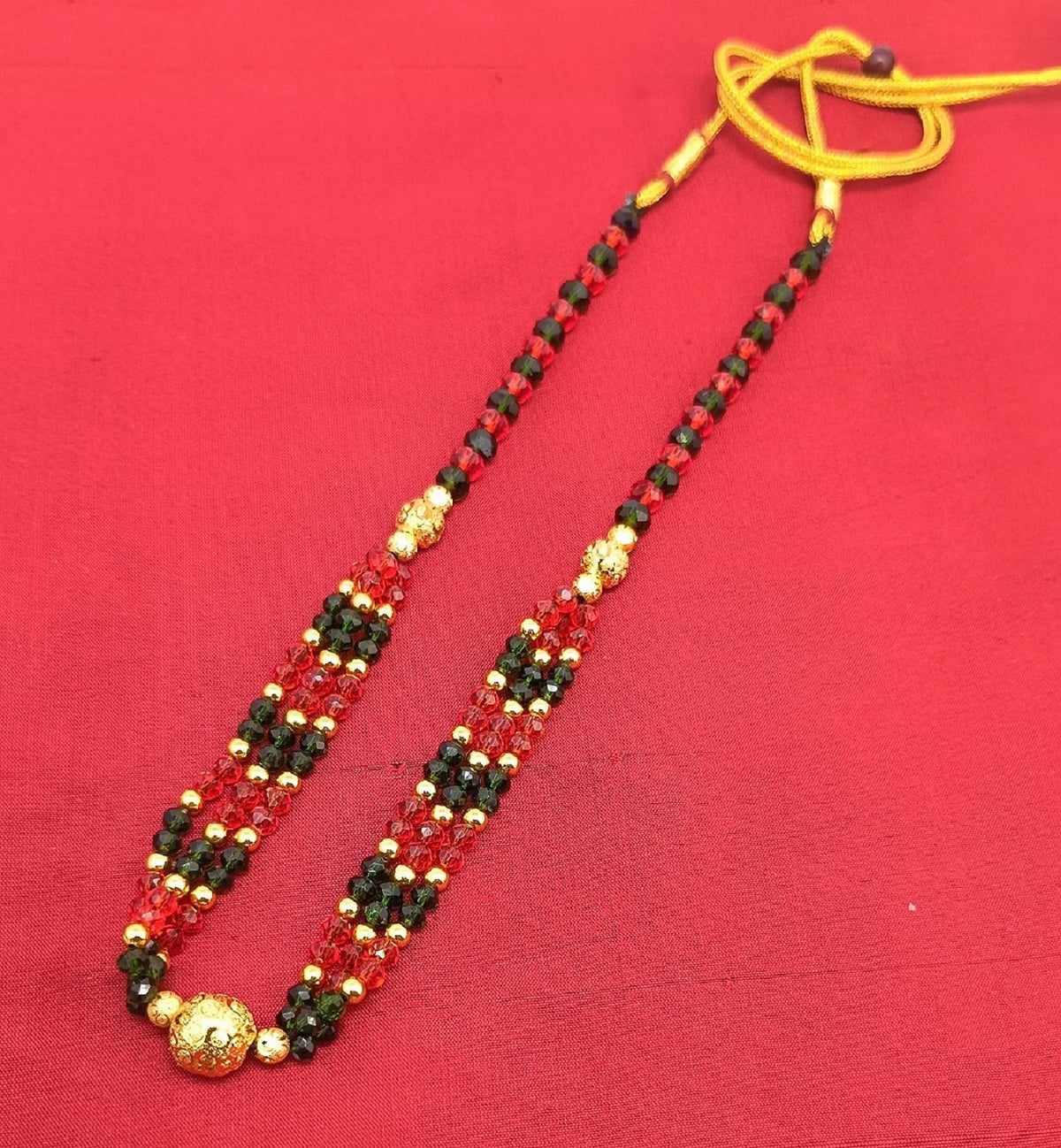Classic Red & Green Beaded Necklace with Golden Centerpiece – Traditional Festive Jewellery for Women
