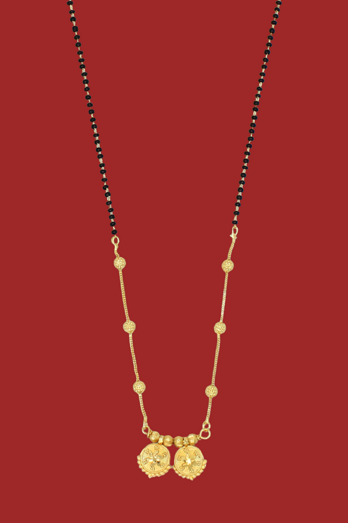Featuring dual gold coin-style pendants embossed with Goddess Lakshmi, the mangalsutra signifies wealth, protection, and blessings. The chain showcases delicate gold bead accents with black beads for a timeless and auspicious touch. Perfect for brides and everyday wearers alike, this piece radiates beauty, devotion, and grace.