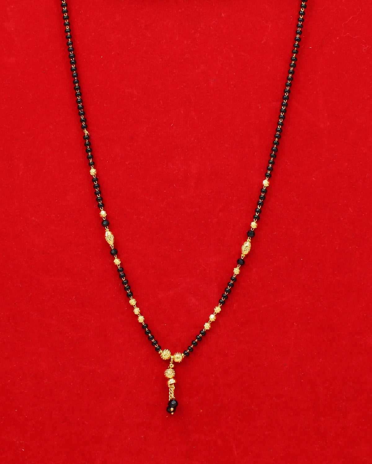 This beautiful piece features finely polished gold beads, classic black beads, and a delicate hanging charm, symbolizing love, purity, and tradition.