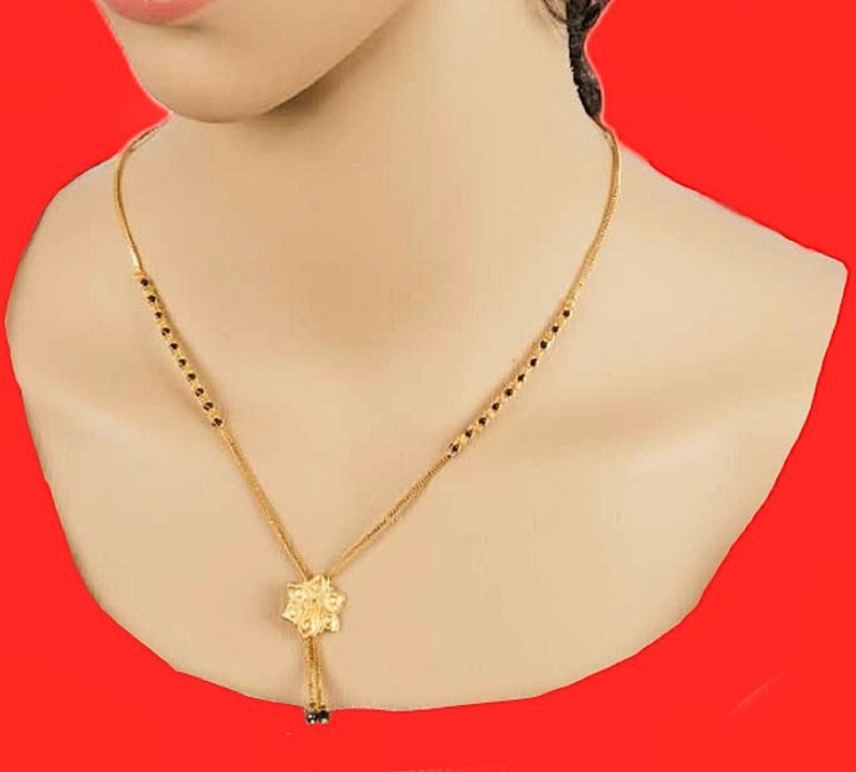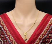 The delicate flower-shaped pendant with black bead tassels symbolizes elegance and love — making it perfect for daily wear, festive occasions, or gifting.