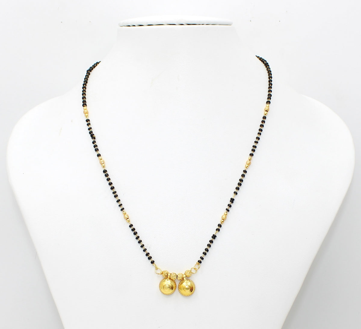This mangalsutra features twin round gold pendants with intricate detailing, symbolizing love and prosperity. The black-bead chain with golden highlights adds a perfect touch of elegance — ideal for both daily wear and festive occasions.
