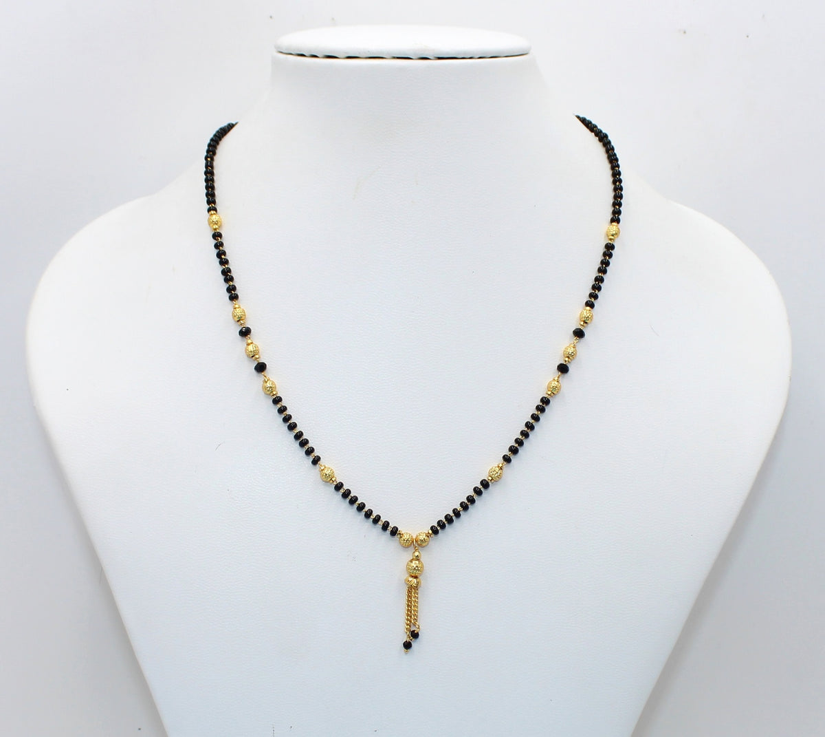 Featuring finely polished gold beads, traditional black beads, and a delicate hanging tassel pendant, this piece symbolizes purity, love, and elegance.