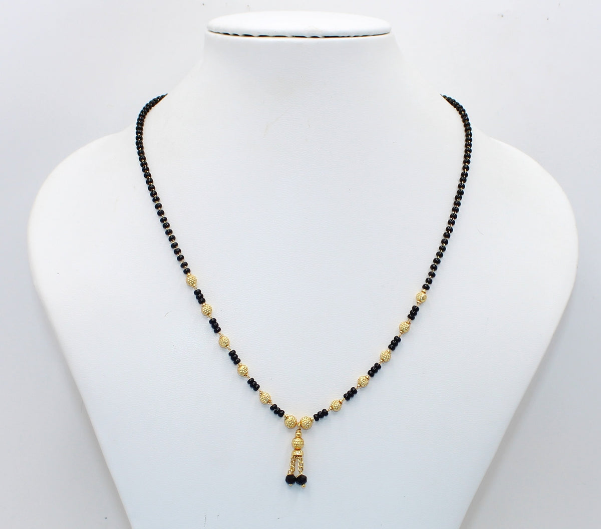 Crafted with premium imitation gold plating and fine black beads, it features an elegant gold drop tassel at the center, adding a subtle sparkle and charm to your neckline.