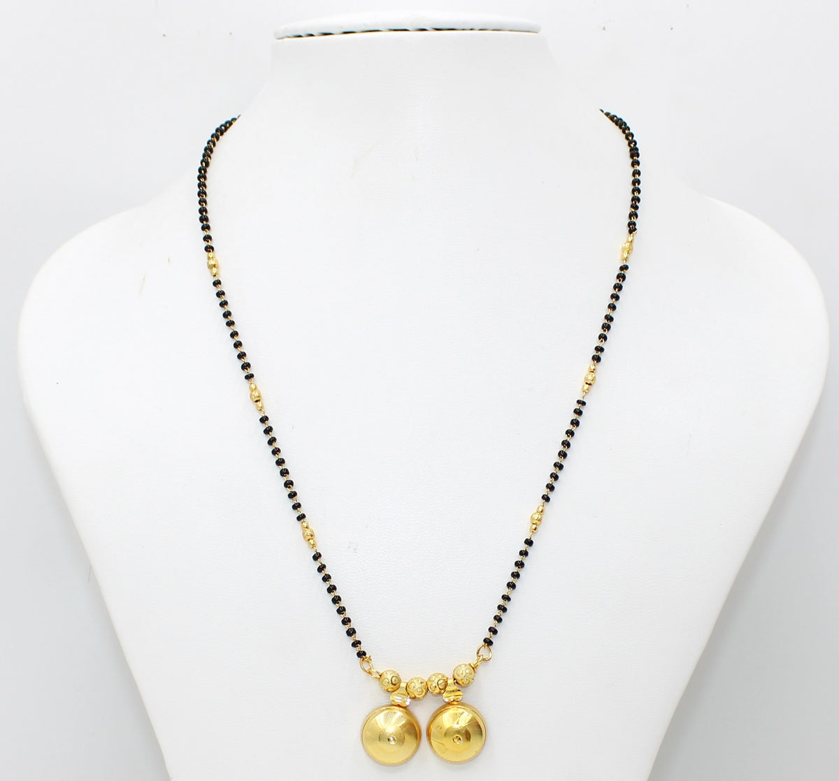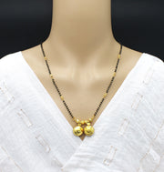 This elegant piece features two golden round pendants symbolizing the sacred bond of marriage, beautifully strung on a traditional black-bead chain with gold highlights. Its minimal yet luxurious design makes it perfect for daily wear or festive occasions, offering the perfect blend of elegance, comfort, and durability.