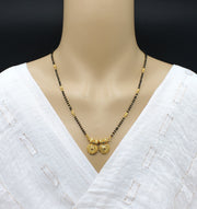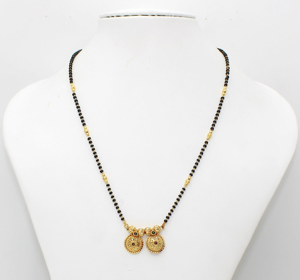 Featuring two intricate coin pendants embellished with fine detailing and set on a classic black bead chain, this mangalsutra symbolizes divine blessings and marital harmony. Its rich gold polish and lightweight design make it a perfect blend of tradition and everyday elegance.