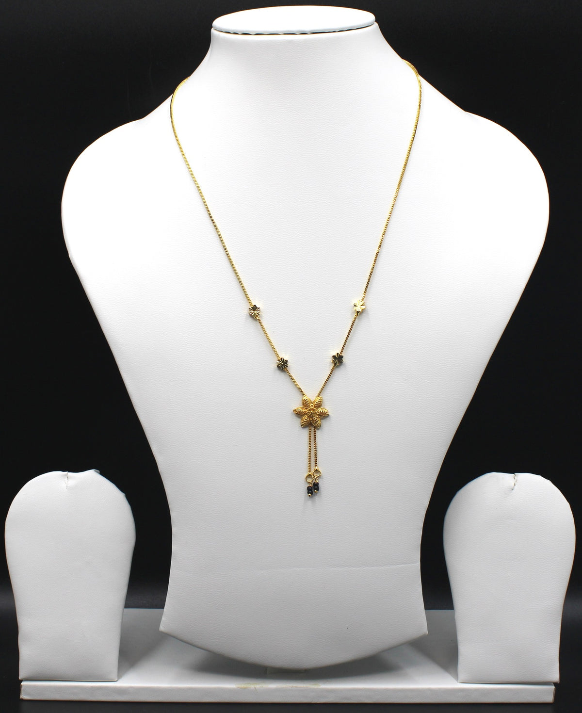 Celebrate love and tradition with this Elegant Floral Gold-Plated Mangalsutra, beautifully designed with a delicate floral centerpiece and classic black bead accents. Its minimal yet traditional look makes it perfect for daily wear, adding just the right touch of elegance to your sarees or casual outfits.