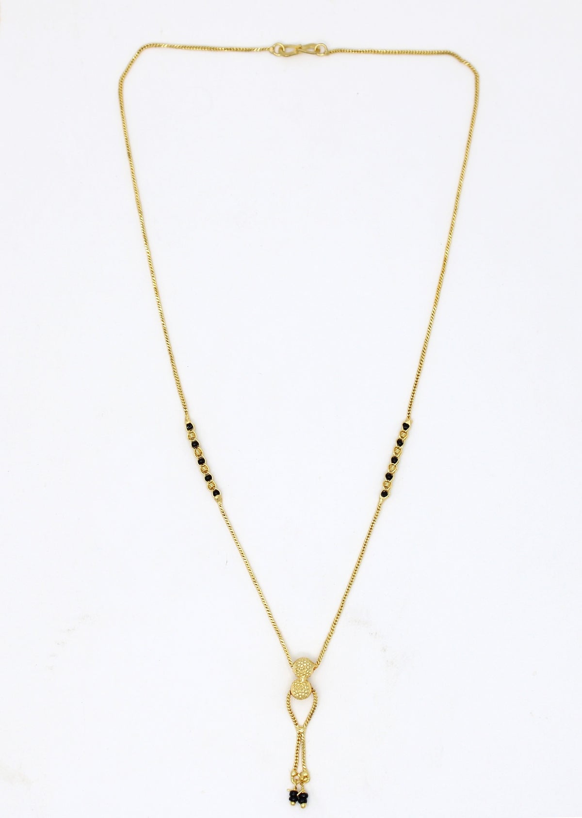 Crafted with a sleek gold-plated chain featuring delicate black beads and dual textured gold balls at the center, this mangalsutra symbolizes everlasting love and grace.