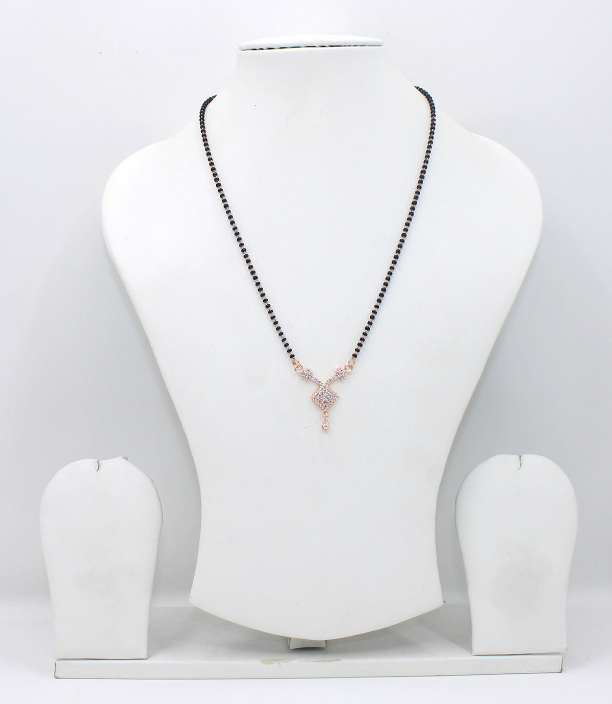 This stunning mangalsutra features a rose gold-plated chain with black beads and a diamond-cut pendant design that exudes class and sophistication. The intricate craftsmanship and minimal elegance make it ideal for both daily wear and festive occasions — symbolizing love, beauty, and grace.